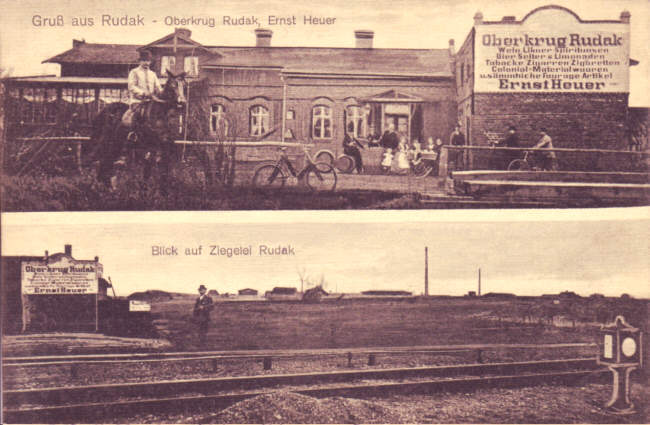 Gruß aus Rudak - Oberkrug Rudak, Ernst Heuer / Blick auf Ziegelei Rudak. gelaufen 22.02.1915