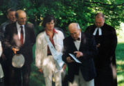 Der stattliche Pfarrer Loskot im Habit des evangelischen Pastors hielt Andacht und Weihe in polnisch. Mein Landsmann Adolf Fiebig übersetzte für die Deutschen, und es fand etwas statt, was vor wenigen Jahren noch undenkbar gewesen war: Polen und Deutsche aus dem historischen Kulmerland standen einträchtig zusammen, beteten und sangen zum Gedenken der auf diesem Friedhof ruhenden Deutschen. Horand Henatsch stimmte den Choral "Lobet den Herren" an, Direktor Kaldowski einen Gregorianischen Wechselgesang - er mit wunderschöner Stimme. Viele Sträuße wurden niedergelegt. Die polnischen Damen zündeten Gedenkkerzen an