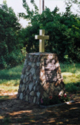 Wir fanden den Friedhof verwildert und zugewachsen, auf den freien Flächen vereinzelte Grabeinfassungen aus Kunststein, von Unkraut und angesamten Bäumchen überwuchert. Wir trafen auch auf Hinterlassenschaften einer Kuh. An den ehemaligen Schutzzaun erinnerten wenige im Gestrüpp liegende Betonpfähle. Andrerseits bot sich eine gute Perspektive dadurch, daß sich in der langen Zeit aus den Heckenbuchen des Hauptweges Bäume entwickelt hatten. Die bildeten nun eine Allee, an deren Ende das geplante Denkmal stehen könnte. Mein vorbereiteter Entwurf, ein Pyramidenstumpf aus Granitmauerwerk mit einer eingelassenen Tafel und einem aufgesetzten Kreuz aus Edelstahl wurde akzeptiert. Von einem Vorschlag, den Friedhof bis auf eine Baumgruppe total zu räumen, wurde abgeraten. Die alten Bäume dort sollten erhalten bleiben.