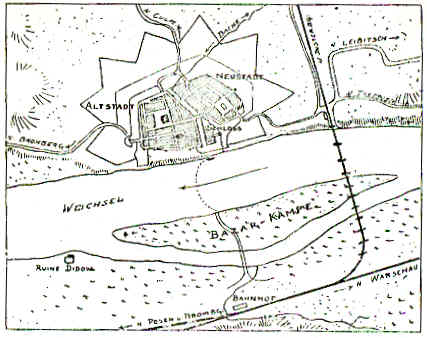 Das Plateau des Culmerlandes wird südlich und westlich von der Weichsel umflossen. In alten Zeiten ildete das Flussthal ein breites unwegsames Sumpf- land. Nur an einer Stelle treten die Uferhöhen von beiden Seiten nahe an den Fluss heran, eine Insel erleichterte hier ausserdem den Uebergang. Hier gründeten die Ordensritter Schloss und Stadt Thorn. Die Anlage bezweckte Sicherung des Weichselühergangs und die Gewinnung einer Operationsbasis für die Eroberung des Culmerlandes. Der Punkt ist mit strategischem Scharfblick gewählt. Auch heut wieder hat man Thorn für die östliche Reichsgrenze zum Waffenplatz ersten Ranges ersehen. Unsere Strategen richten damit ihren Ritter-Cameraden ein Denkmal der Anerkennung ans. Die Stadtanlage besteht aus Altstadt und Neustadt, zwischen beide klemmt sich wie ein Keil das Schlossgebiet ein. Die Bache, ursprünglich ein Neben- flüsschen der Drewenz, füllt Stadt- und Schlossgräben mit Wasser und treibt die im Schlossterrain belegenen Mühlen. Die Altstadt legt sich mit breiter Basis an das Weichselufer, ihre Hauptstrassenzüge munden hier auf die Landungs- und Stapelplatze. In Mitten der Stadt erhebt sich die massige Pfarrkirche zu St. Johann, und auf einem stattlichen Marktplatz das altehrwürdige Rathhaus. In der Nordwestecke der Stadtmauer liegt die ehemalige Franziskanerkirche zu St. Marien. [7] Das Schloss hat sich in gleicherweise die Verbindung mit der Weichsel gesichert, schlecht aber ist in dieser Hinsicht die Neustadt weggekommen, sie liegt, wie es sich denn auch in der Geschichte ausprägt, unter Botmässigkeit des Schlosses und der Altstadt. Aus dem Mittelalter hat die Neustadt nur das Gebäude der St. Jakobskirche bewahrt. Das Rathhaus, früh bereits zu einer Kirche umgewandelt, hat vor er. 50 Jahren einem neuen Kirchenbau Platz machen müssen. Das Kloster und die Kirche der Dominikaner, eine Gründung; älter als die Ncustadt selbst, ist um dieselbe Zeit, angeblich wegen Baufälligkeit beseitigt. Ausser den erhaltenen Bauwerken ergänzen uns eine Reihe alter Zeichnungen das mittelalterliche Stadtbild. Die werthvollste Quelle ist eine Stadtansicht vom Jahre 1581 auf dem Neisserschen Epitaph in der Marienkirche (Taf. I). Im Privatbesitz, jedoch in Photographien zu haben, ist eine Anzahl archäologisch werthvoller Handzeichnungen vorhanden, anscheinend um das Jahr 1700 gefertigt, welche Ansichten der Stadt und einzelner zum Theil jetzt vernichteter Gebäude darstellen. Zwei in Perspective gezeichnete Stadtpläne von Dahlberg in Puffendort's res gestae Caroli Gustavi geben besonders zuverlässig die alte Stadtbefestigung wieder. Ein noch ausführlicherer Perspectivplan von 1559 ist Zerneckes Thörner Chronik beigegeben. Sehr werthvoll ist endlich ein im Rathsarchiv befindlicher, sorgfältig gefertigter Stadtplan von 1816 (vor der Inangriffnahme der modernen Festungswerke aufgenommen), auf welchem dir mittelalterlichen Baureste besondere Berücksichtigung gefunden haben. Unter kritischer Benutzung dieser Quellen und mit Berücksichtigung des heutigen Befundes ist der auf Taf. I gegebene und im 3. Abschnitt beschriebene Grundriss rekonstruirt