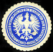 EINKOMMENSTEUER-VERANLAGUNGS-KOMMISSION FÜR DEN STADTKREIS THORN blau, weiß, geprägt |