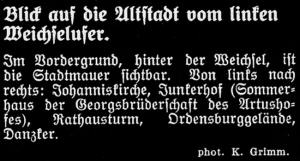Entstehungsjahr: ca 1935 Photograph: ![]() Maße: 22,6 x 17,0 cm Motiv: Blick auf die Altstadtvom linken Weichselufer. Beschriftung hinten: Textdruck: - siehe rechts unten - Stempel: - siehe oben - handschriftlich: I 22 Privatbesitz: Volker Krüger |