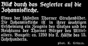 Entstehungsjahr: ca 1935 Photograph: ![]() Maße: 17,0 x 23,0 cm Motiv: Blick durch das Seglertor auf die Johanniskirche Beschriftung hinten: Textdruck: - siehe rechts unten - Stempel: - siehe oben - handschriftlich: I 29 Privatbesitz: Volker Krüger |
