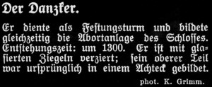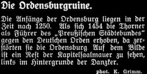 Entstehungsjahr: ca 1935 Photograph: ![]() Maße: 23,0 x 17,3 cm Motiv: Die Ordensburgruine Beschriftung hinten: Textdruck: - siehe rechts unten - Stempel: - siehe oben - handschriftlich: IV 17 und IV 21 Anmerkung: links im Hinergrund sieht man natürlich nicht den Danzker, sondern die Jaklobskirche und die Katharinenkirche oder auch Garnisonskirche! Privatbesitz: Volker Krüger |