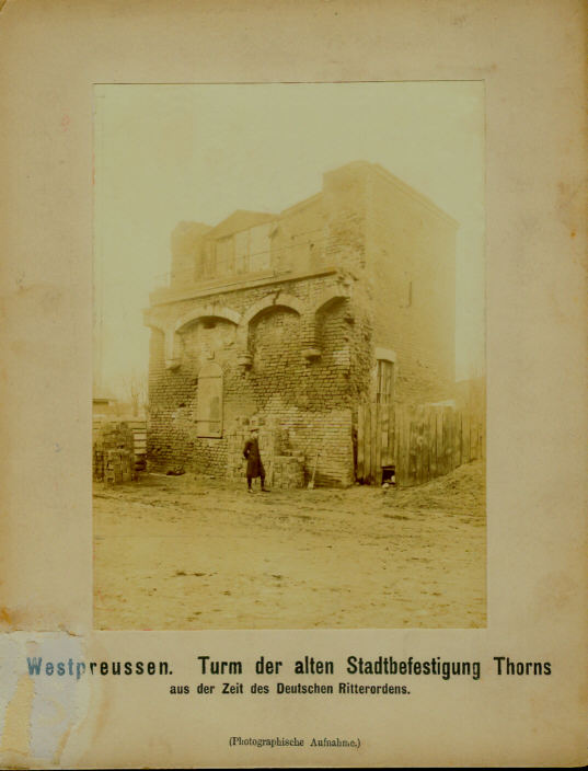 ![]() Entstehungsjahr: 1904 Photograph: ???? - auf Karton gezogen - Maße: Bild: 12,0 x 17,8 cm Karton: 18,8 x 24,2 Beschriftung vorn: Westpreussen. Turm der alten Stadtbefestigung Thorns aus der Zeit des Deutschen Ritterordens (Photographische Augnahme.) Beschriftung hinten: Stempel, blau: B 1 Westpr. Thorn Kastenstempel, blau: 1904 Stempel, rot: B 04260 Sch....dienst Berlin S.W.68 Kastenstempel, rot: Leihweise! Nach Reproduktion zurück Privatbesitz: Volker Krüger |