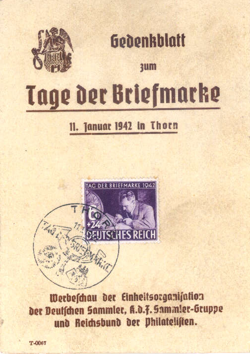 Deutsches Reich 6 + 24 Tag der Briefmarke 11. Januar 1942 in Thorn Sammler: V. Krüger |